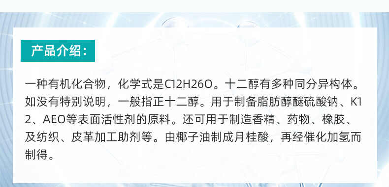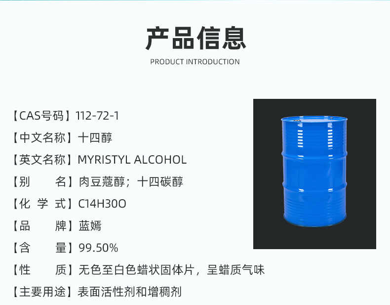 工業(yè)級十四醇別名:肉豆蔻醇;十四醇;1-十四醇;1-十四醇(GC標(biāo)準(zhǔn) gt;99%);正十四醇 標(biāo)準(zhǔn)品;1-十四醇-GCS;正十四醇;1-十四醇(肉豆蔻醇、十四醇、正十四醇、豆蔻醇、1-十四烷醇、C14醇) 觀白色固體, 用途:用作有機(jī)合成和表面活性劑的原料;食用香料。;有機(jī)合成。氣相色譜分析標(biāo)...